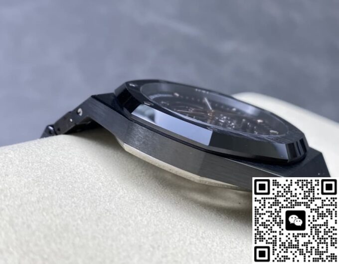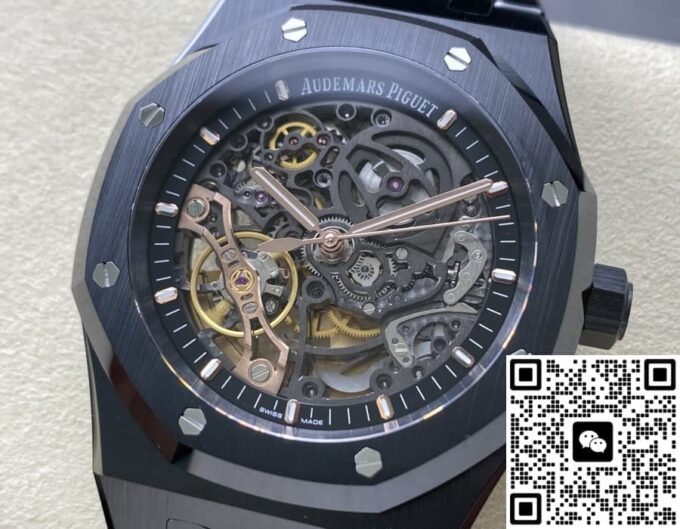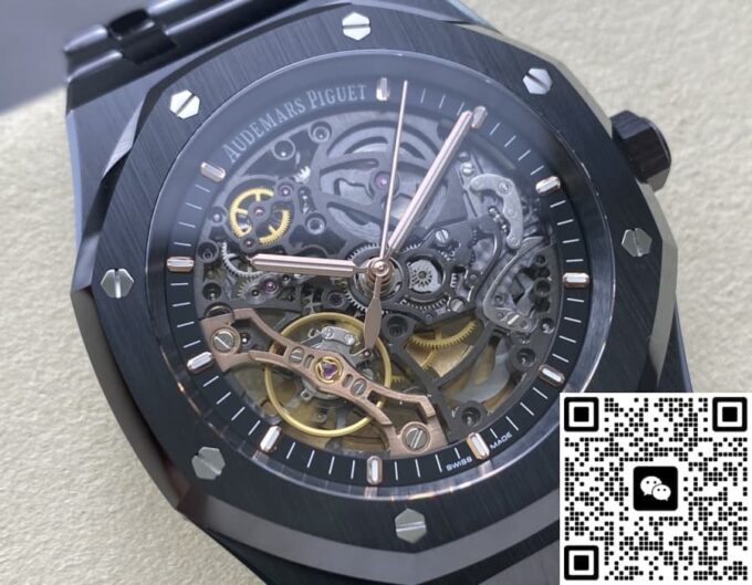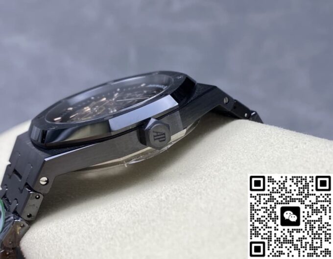 表壳采用 316L 精钢锻造,整体线条延续了皇家橡树系列标志性的八角形表圈设计,8 颗外露的六角形螺丝不仅是视觉焦点,更通过 CNC 数控机床精确控制螺丝深度与角度,确保每颗螺丝的开槽方向完全一致。表圈经过 12 道工序打磨,侧面拉丝与顶面抛光的过渡区域形成完美直角,在不同光线下展现出金属材质的丰富质感。