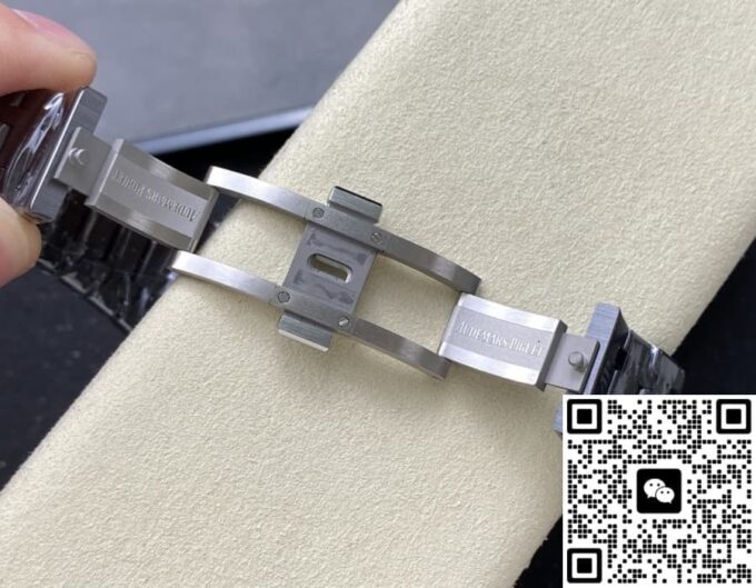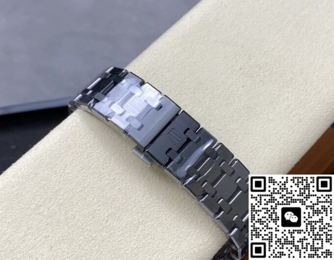 复刻手表配备精钢材质的 “AP” 链带,每节链节均由五部分组成,中间三排链节采用抛光处理,两侧链节则保留拉丝质感,形成经典的 “隐形” 链带视觉效果。链节之间的衔接轴采用高精度圆柱形销钉,确保佩戴时链带贴合手腕曲线而无卡顿感。表扣部分隐藏式设计,按压式开关经过 20000 次开合测试,弹簧力度适中,闭合时伴有清脆的锁定声。