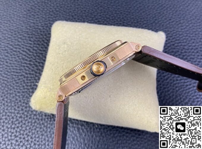 表径42毫米,表壳厚度12.05毫米,整体比例协调,无论是男性还是女性佩戴,都能展现出大气而不失精致的风格。青铜表壳的独特质感与棕色表盘、黑色编织橡胶表带相互搭配,形成视觉上的层次感与连贯性。针扣设计可根据手腕粗细灵活调节,确保佩戴牢固且舒适。无论是搭配正装出席正式活动,还是搭配休闲装日常出行,这款复刻表都能成为点睛之笔,展现出佩戴者对细节与品质的追求。
