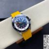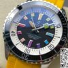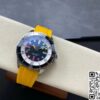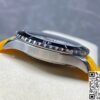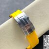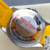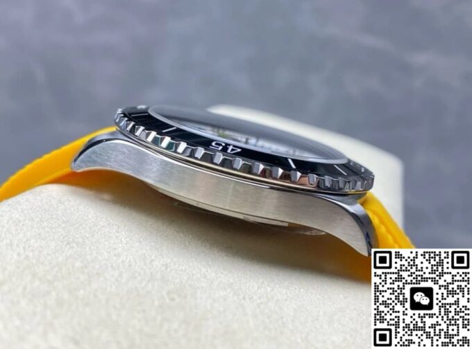表壳材质选用精钢,经精细加工,质感硬朗且具备良好抗磨损、抗腐蚀特性,长久使用仍能保持外观崭新。表圈采用陶瓷棘轮式单向表圈,陶瓷材质坚硬耐磨,色泽稳定,单向转动设计契合潜水表操作逻辑,既提升实用性,又为外观增添独特机械美感 。表镜采用弧面蓝宝石水晶玻璃,双面防眩处理,有效减少光线反射干扰,无论强光还是弱光环境,都能清晰读取时间。表冠为旋入式设计,搭配双密封垫,强化防水性能同时,操作时段落感清晰,调校时间精准便捷 。表带材质选用橡胶,黄色表带配色大胆且富有活力,橡胶质地柔软亲肤,具备出色柔韧性与耐磨性,贴合手腕的同时,能适应不同温度变化,不易变形开裂。色彩上,黄色与黑色表盘形成鲜明视觉冲击,时尚辨识度拉满 。时标类型除了实用夜光功能,棒状造型简约利落,与圆形表盘、精钢表壳等元素搭配,构建出简洁而富有力量感的视觉体系。表耳间距 22mm,适配多种常规表带替换,方便根据个人喜好与穿搭风格,灵活变换表带,拓展佩戴可能性 。