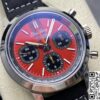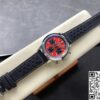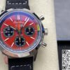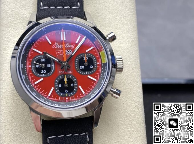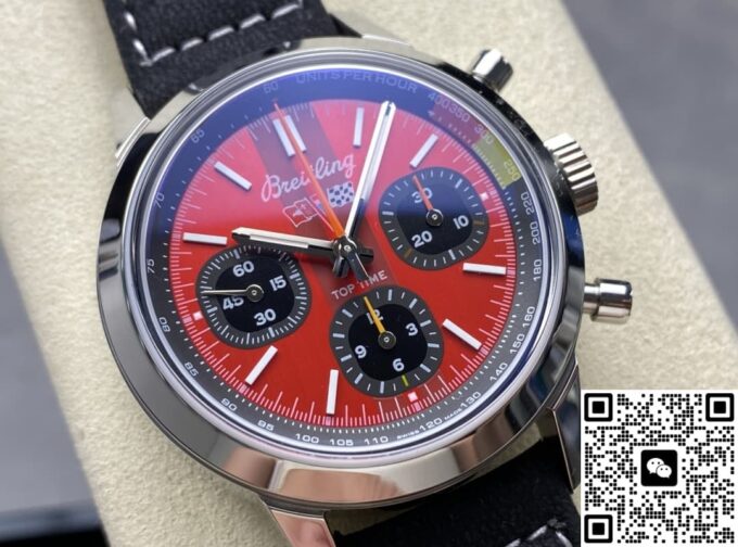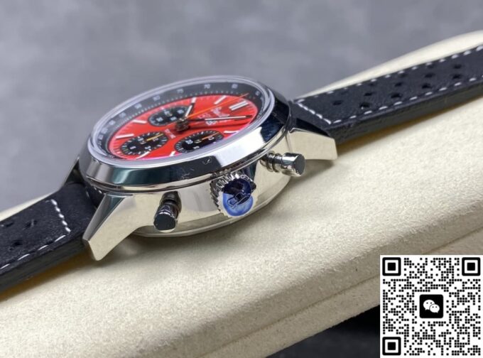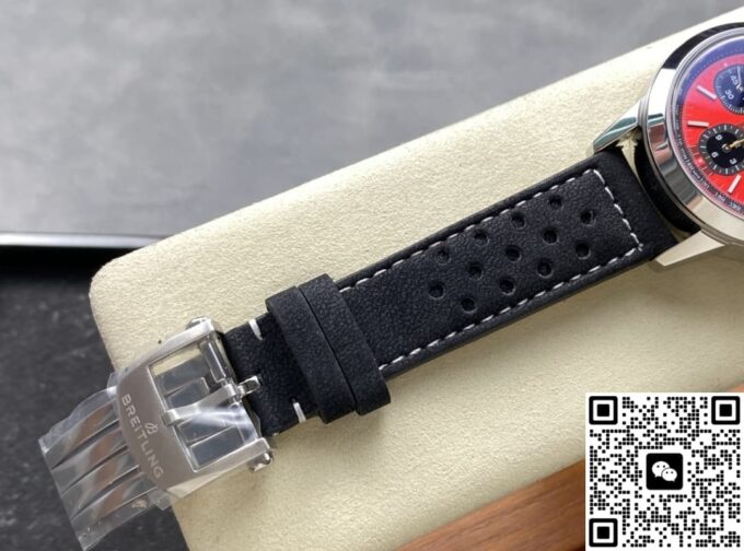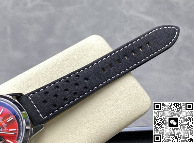红色表盘是这款表的标志性特征,BLS 工厂精心调配色彩,还原出原装那种浓郁且富有活力的红色调,搭配对比鲜明的黑色小表盘,呈现出经典的赛车计时风格。夜光涂层时标、时针及分针,在保证夜光功能的同时,颜色与形态都力求贴近原装,黑暗环境下,清晰读时的同时,也延续了百年灵独特的美学标识。棒状时标设计简洁利落,与整体复古赛车主题相得益彰,每一处时标刻度的大小、间距,都经过精细考量,复刻出原装的规整与精致。黑色小牛皮表带,纹理自然,质感柔软,贴合手腕肌肤,佩戴舒适度高。折叠扣设计,与原装一致,操作方便且能有效保障佩戴的稳固性,表扣处的细节处理,如金属部件的色泽、打磨工艺等,都展现出 BLS 工厂对品质的追求,力求在外观与使用体验上,无限贴近原装。