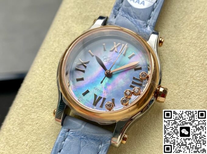 复刻萧邦HAPPY SPORT 278608 – 6013的表盘以浅蓝色为主调,圆形轮廓简约而不失优雅,散发着清新且灵动的气质。表盘采用珍珠母贝材质,在不同光线折射下呈现出细腻的光泽变化,每一处都彰显出复刻工艺对细节的极致追求。时标融合了棒状与罗马数字设计,清晰醒目且排列规整,与指针相互映衬,确保读时精准便捷。表底采用背透设计,透过表镜可清晰观赏内部机芯的运转,复刻工艺在此处展现出高超水准——机芯结构布局逼真,齿轮运作模拟精准,不仅是时间记录的核心,更是机械艺术的微缩展示,满足了表迷对机械美感的追求。