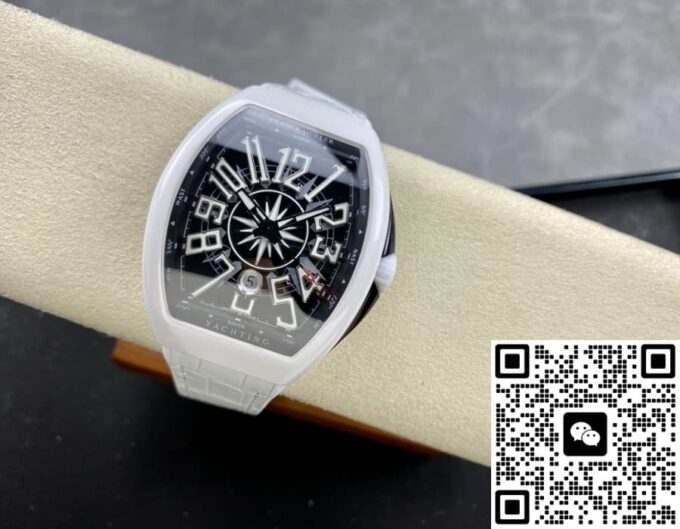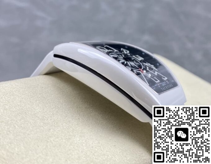 表径 46 毫米的酒桶形设计,赋予手表独特的轮廓比例,白色表壳与黑色表盘的配色方案时尚百搭。无论是搭配正装出席商务场合(白色表壳的优雅与黑色表盘的沉稳相得益彰),还是与休闲装混搭(展现航海主题的自由不羁),都能轻松驾驭,彰显多元风格。白色鳄鱼皮表带的柔软度与表壳的精致工艺相辅相成,佩戴时既贴合手腕又不失格调,折叠扣的稳固性确保运动场景下也不易脱落。整体设计兼顾舒适性与视觉美感,复刻细节让每一次佩戴都成为对法穆兰经典航海风格的致敬,适合追求个性与实用的复刻表爱好者。
