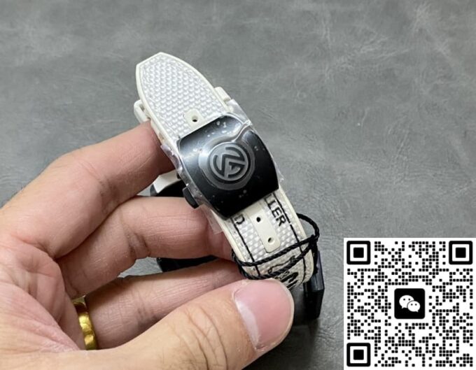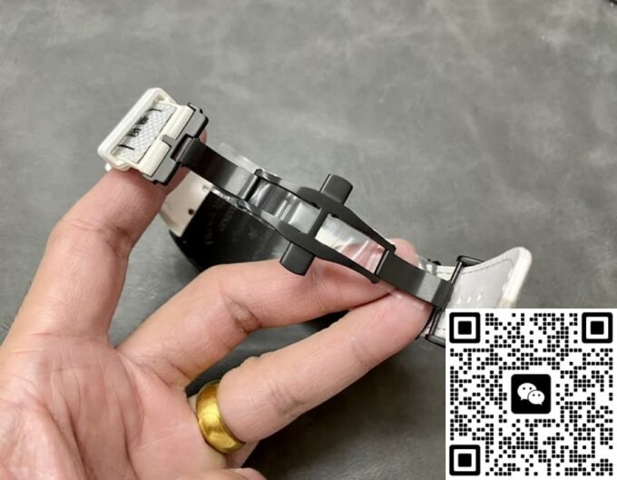 表镜采用蓝宝石水晶玻璃,凭借高硬度与高透光性,抵御日常刮擦的同时,最大程度减少反光干扰,让黑色表盘上的白色元素(时标、罗盘、文字)在任何光线条件下都清晰可辨。表壳以白色精致材质塑造(非贵金属,避免 18k 等描述),质感温润且不易褪色,与黑色表盘形成鲜明对比,凸显设计张力。表带选用白色鳄鱼皮材质,纹理自然流畅,触感柔软细腻,贴合手腕曲线,长时间佩戴无压迫感。折叠扣设计与表壳同色,操作顺滑且佩戴稳固,可根据手腕粗细灵活调节,兼顾美观与实用性。复刻工艺在材质选择上严守品质标准,从表壳的白色质感、表带的鳄鱼皮纹理到表扣的细节处理,均高度还原正品的奢华佩戴体验。