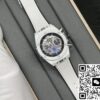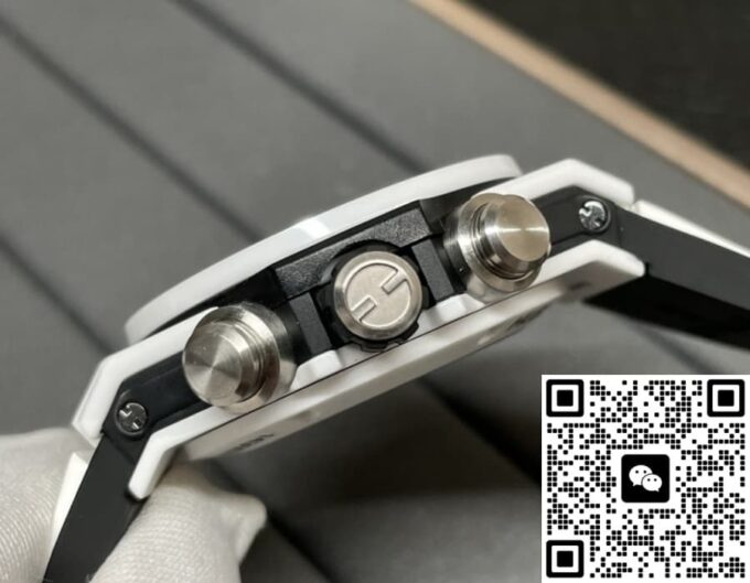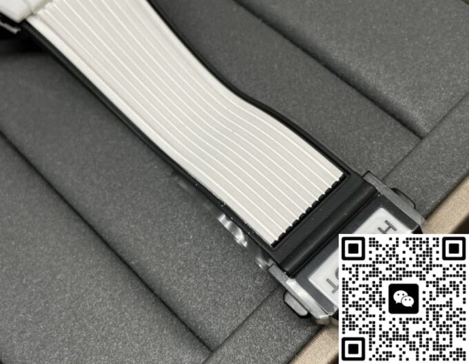 表带与表扣:表带采用结构化带衬里橡胶材质(白色),质地柔软且贴合手腕,长时间佩戴无束缚感;表扣材质为白色陶瓷与黑色镀层钛金属,折叠扣设计操作简便,扣合稳固,复刻出正品 “功能性与美学并重” 的设计理念。橡胶表带的耐用性与陶瓷表扣的精致感结合,既适配运动场景的活力,又能在正式场合中展现低调奢华,完美复刻了宇舶大爆炸系列 “跨界百搭” 的材质哲学。