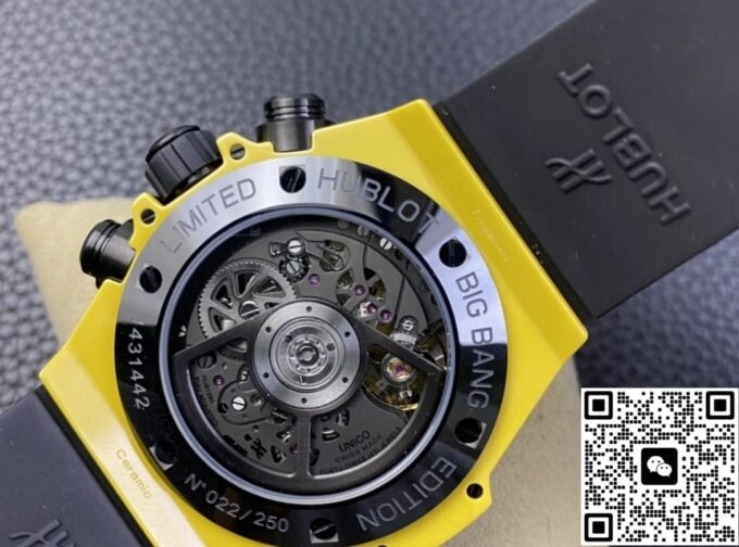表带颜色为黄色 / 黑色搭配,折叠扣表扣类型,复刻表带在材质选择和颜色调配上下功夫,力求呈现出与原版一致的视觉冲击与佩戴舒适度。表底采用微珠喷砂黑色陶瓷,雕刻 “LIMITED EDITION 250NUM” 字样,复刻时对陶瓷材质的处理、喷砂工艺的模拟以及字体雕刻的精细度,都经过反复调试,还原原版的质感与标识。防水性能 100 米,虽为复刻,但在防水工艺上严格遵循标准,采用合适的密封结构与材质,确保日常防水需求。