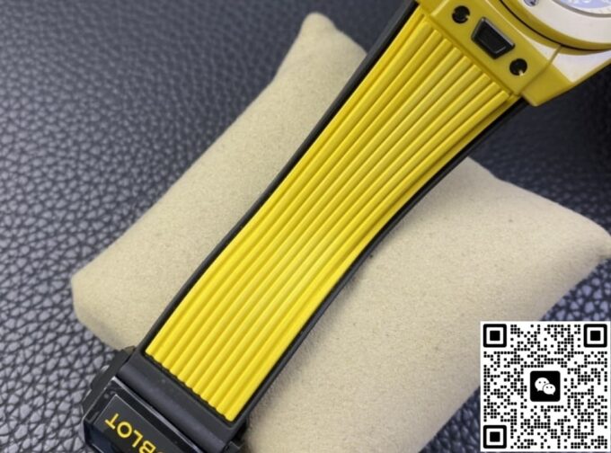 表圈材质同样是黄色陶瓷,与表壳材质相呼应,在制作中保证陶瓷的色泽均匀、质地坚硬。表镜材质为防眩处理蓝宝石,复刻时采用高品质蓝宝石玻璃,经过防眩工艺处理,还原原版清晰通透且不易产生反光干扰的视觉体验。表带材质是结构化带衬里橡胶,在橡胶的纹理、弹性和耐用性上进行复刻,让佩戴时的触感与正品接近。表扣材质为黑色陶瓷和镀黑钛金属,两种材质的融合与处理,复刻出原版的精致与质感,同时保证表扣的实用性与美观度。