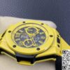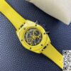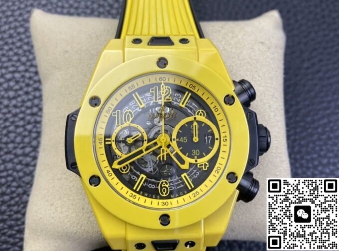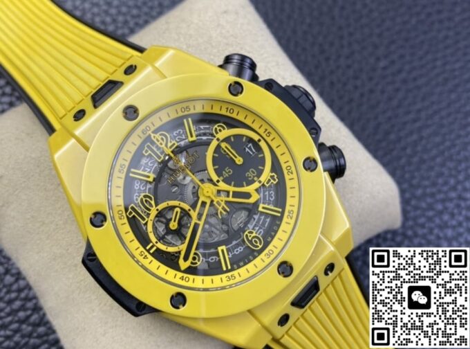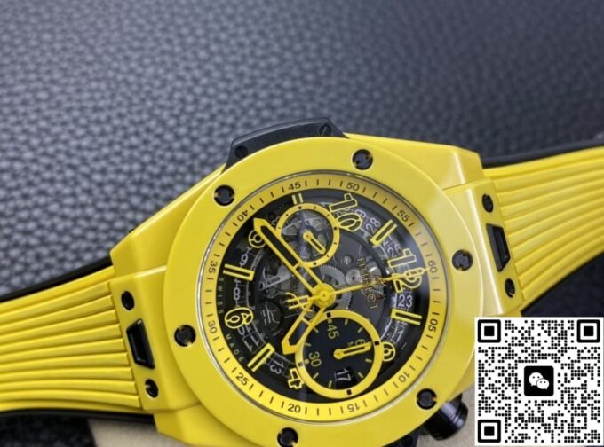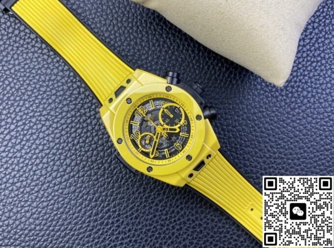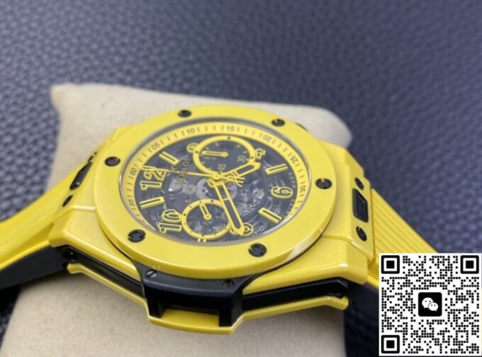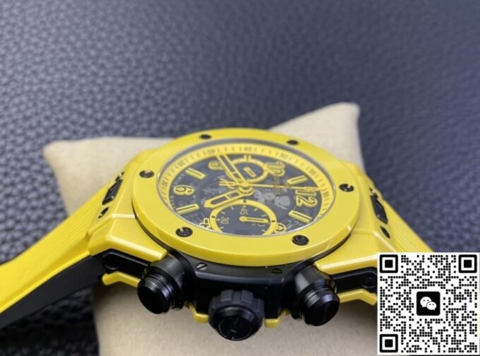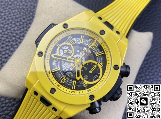 表壳材质选用黄色陶瓷,这种材质兼具美观与耐用性,复刻时对陶瓷的配方、烧制工艺进行研究,力求呈现出与原版一致的色泽和质感。表盘材质为哑光黑及黄色镂空表盘,黄色嵌入式刻度覆以黑色夜光涂层,在材质搭配和涂层处理上,复刻表精准还原,让表盘的视觉层次与功能性得到体现。