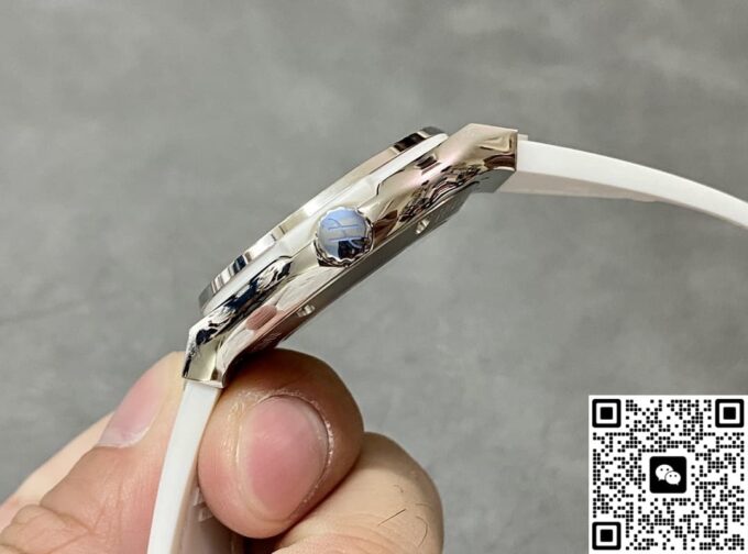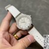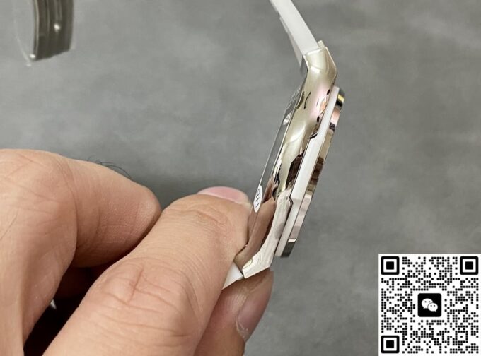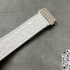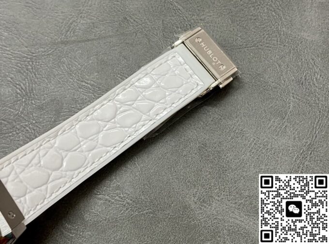 表带选用了优质的鳄鱼皮与橡胶材质相结合。鳄鱼皮部分质地柔软细腻,纹理清晰自然,贴合手腕肌肤,带来舒适的佩戴感受。橡胶材质则增加了表带的耐用性和实用性,使其更适应不同的环境和活动。白色的表带与表盘颜色相呼应,整体视觉效果和谐统一,无论是日常佩戴还是特殊场合,都能展现出独特的魅力。