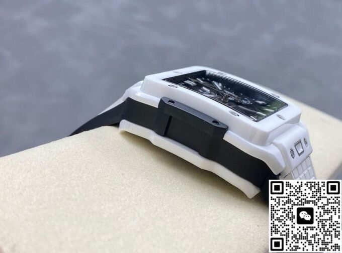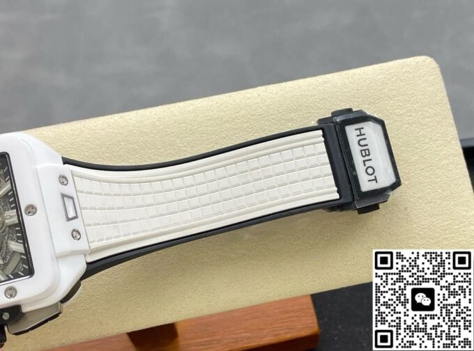 表盘颜色为镂空设计,搭配白色表带,色彩搭配简约又富有辨识度。表壳材质选用陶瓷,复刻陶瓷材质在硬度、光泽度上严格对标原版,陶瓷的耐磨、耐腐蚀特性,让表壳长久保持美观。表圈材质采用微珠喷砂与抛光陶瓷附 6 颗 H 形钛金属螺丝,微珠喷砂与抛光工艺结合,打造出独特的质感层次,6 颗 H 形钛金属螺丝精准复刻位置与形态,不仅是装饰,更强化表圈结构。表镜与表冠材质也精心复刻,防眩处理蓝宝石镜面,有效减少光线反射,保证清晰读时,陶瓷表冠则在质感与操作手感上贴近原版,每一处材质选用与工艺处理,都为还原腕表外观与品质服务。