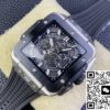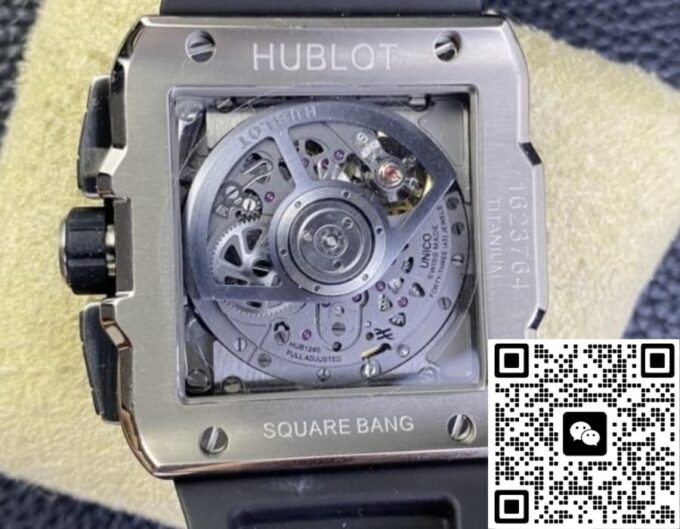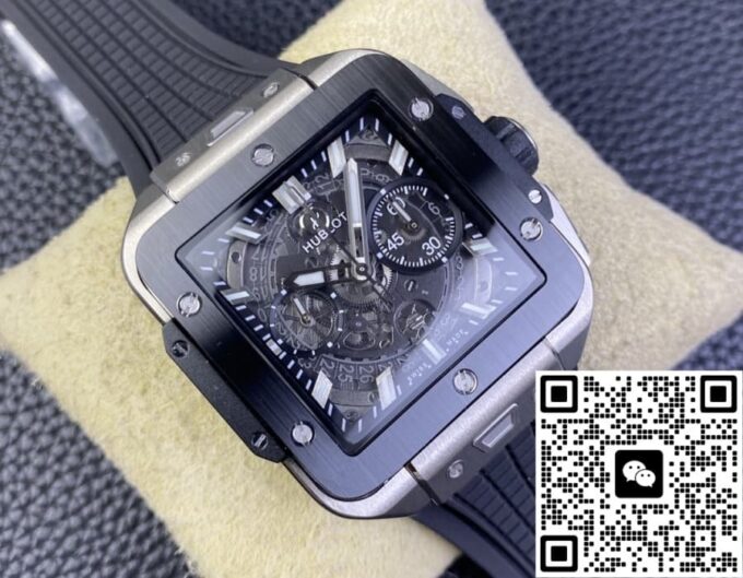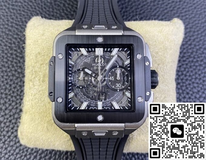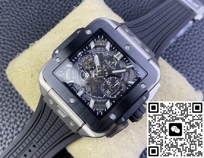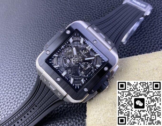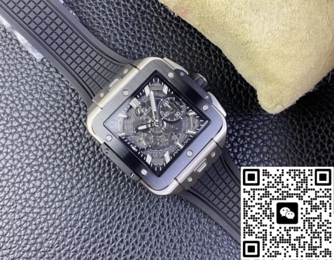 复刻宇舶 SQUARE BANG UNICO 821.NM.0170.RX 的表盘设计独树一帜。它采用镂空的方形轮廓,打破传统表盘的常规形态,展现出强烈的现代感与科技感。42 毫米的表径,搭配 14.5 毫米的表壳厚度,整体比例恰到好处,既不会显得过于庞大张扬,又能在腕间展现出独特的存在感。
