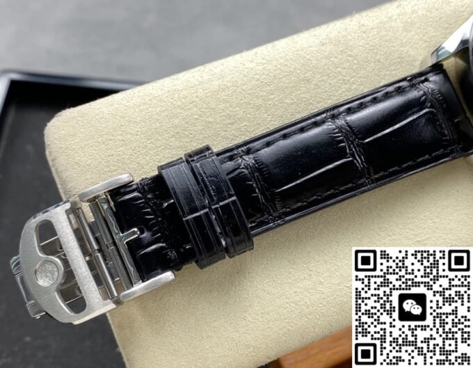 表壳以精钢材质打造,经过多道工序打磨,呈现出细腻而光滑的质感。40.4 毫米的表径,厚度 12.3 毫米,这样的尺寸比例经过精心考量,佩戴在手腕上既不会显得过于张扬,又能清晰展现其存在,兼顾了舒适性与视觉上的精致感。精钢材质不仅赋予表壳出色的耐用性,可抵御日常轻微磕碰与磨损,还具备良好的亲肤性,长时间佩戴也不会感到不适。表带选用黑色鳄鱼皮材质,每一寸皮革都经过严格筛选与处理,纹理清晰且自然,展现出独特的奢华质感。鳄鱼皮表带的制作工艺精湛,柔软度与韧性恰到好处,随着佩戴时间增长,会逐渐贴合手腕曲线。搭配的精钢折叠扣设计简洁大方,表面经过细腻处理,触感光滑,扣上时“咔嗒”一声清脆利落,确保佩戴稳固。