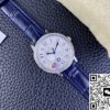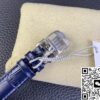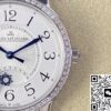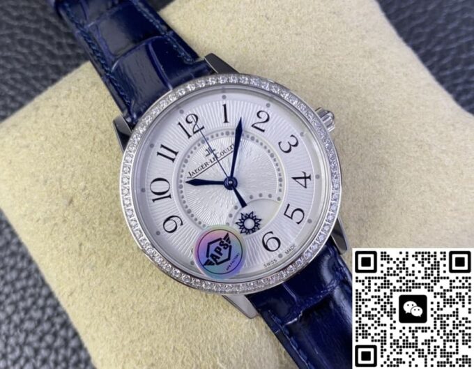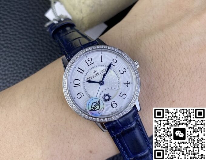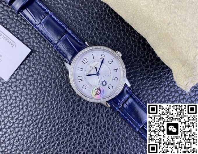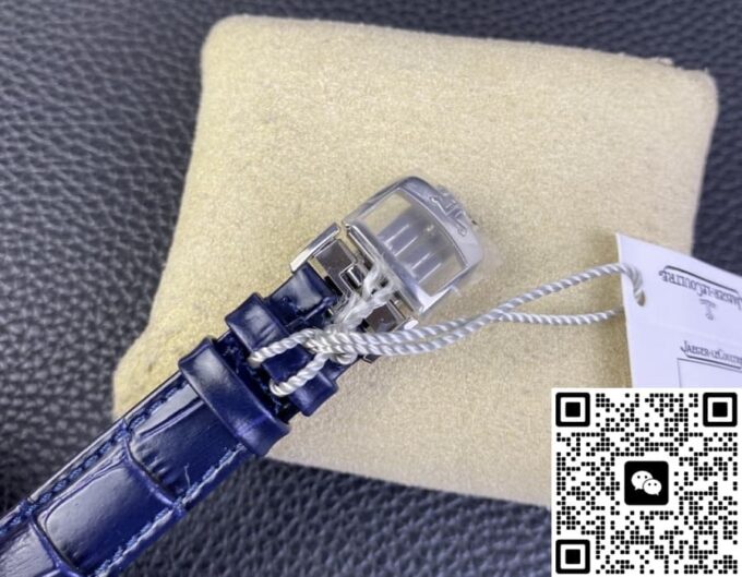 蓝色意大利小牛皮表带采用植鞣工艺处理,皮质柔韧且纹理细腻,经久使用不易开裂。折叠扣内衬陶瓷滚珠轴承,开合顺滑无声;扣身外侧以拉丝与抛光双工艺打磨,镌刻“JAEGER-LECOULTRE”品牌标识,字体深度与正品误差仅微米级。整表重量严格控制在72克以内,搭配34毫米表径,完美适配女性纤细手腕。