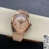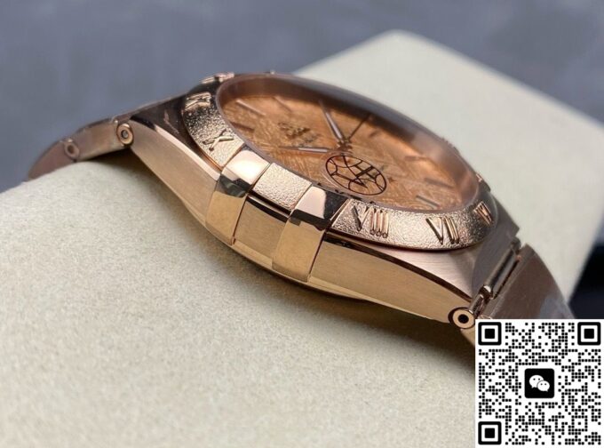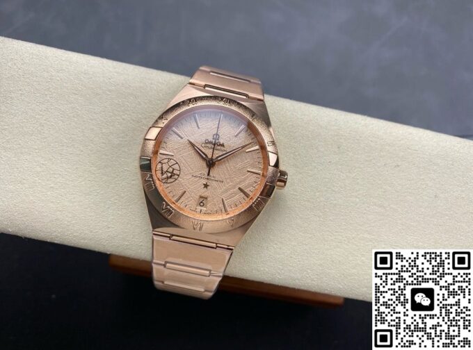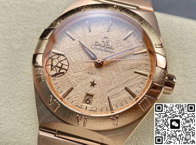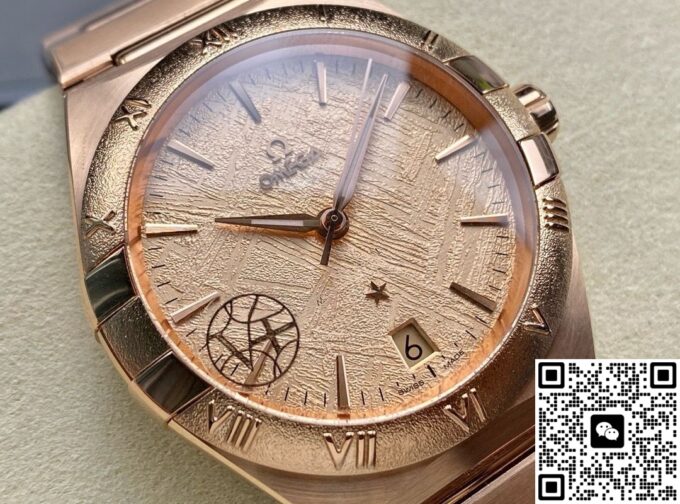 欧米茄星座131.50.41.21.99.002 V+厂 V2版复刻手表最引人瞩目的亮点之一,莫过于其独一无二的表盘。表盘并非采用普通金属或漆面,而是选用了极其珍稀的真正铁陨石作为基础材质。每一块铁陨石都拥有独一无二、无法复制的维斯台登纹路,这是亿万年前宇宙星体内部的结晶结构,是大自然鬼斧神工的杰作。在这天然的陨石基底上,复刻表运用了先进的PVD物理气相沉积工艺,将迷人的Sedna金色均匀、牢固地沉积于陨石表面。这使得欧米茄星座131.50.41.21.99.002复刻手表的表盘呈现出一种奇妙的粉金色调,既保留了陨石原始的粗犷纹理和深邃宇宙感,又覆上了一层温暖奢华的金色光辉,在光线下变幻莫测,美不胜收。表盘为经典圆形,直径41毫米,厚度13.5毫米,比例协调,佩戴于腕间气度非凡。