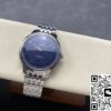 这款复刻碟飞采用40毫米圆形表盘,厚度9.9毫米,尺寸优雅大气。表盘经深蓝色PVD处理,表面不规则排列的垂直纹理呈现太阳射线般的打磨效果,搭配“轨道式”分钟圈,层次丰富且富有动感。时标设计独具匠心,罗马数字刻度与弧面形小时刻度交替出现,立体感十足;镀铑指针运行精准,在深蓝色表盘的衬托下清晰醒目,无论光线明亮或昏暗,读时都毫不费力,复古与现代感在此完美交织。
