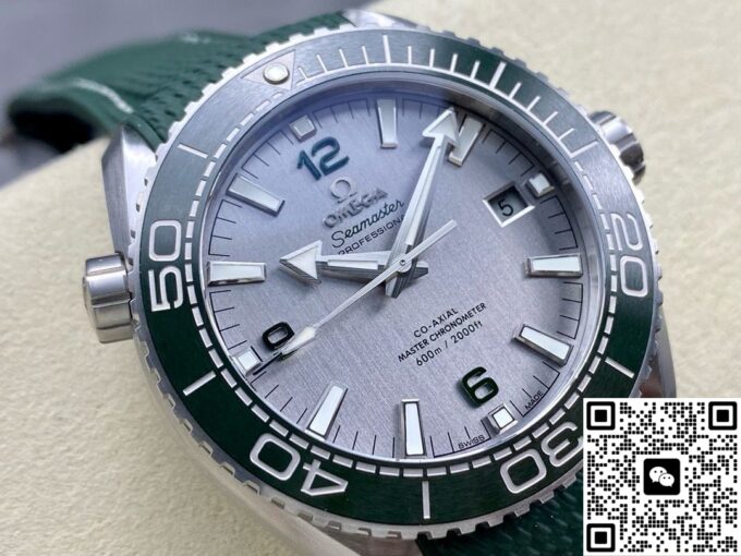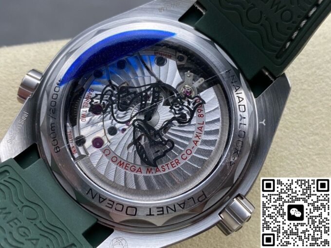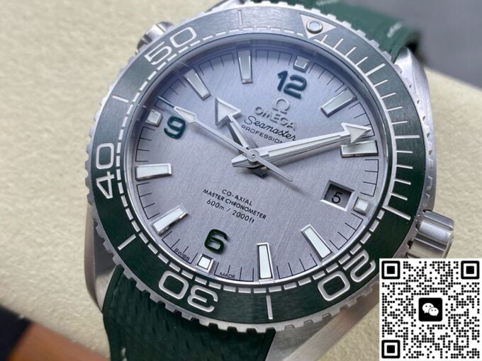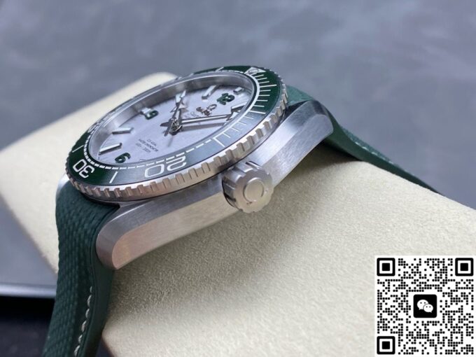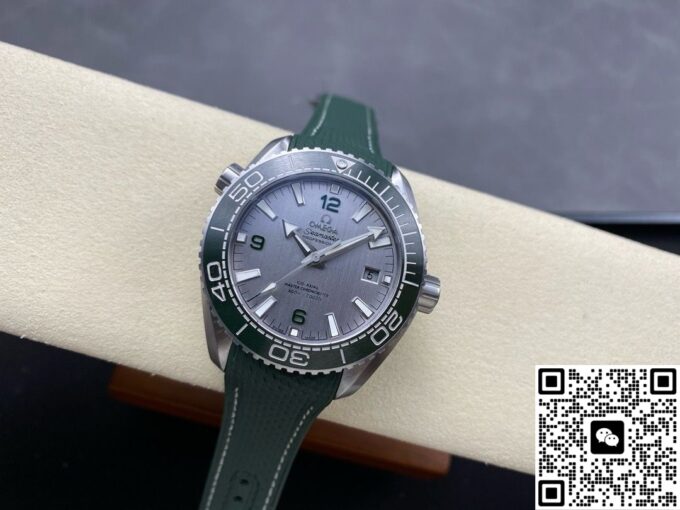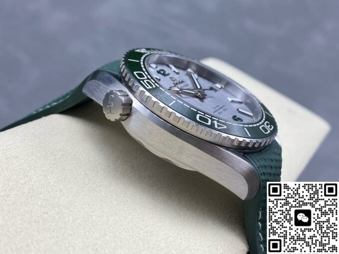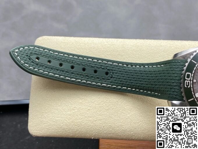 在材质选用上,复刻欧米茄海马此款手表,力求还原正品质感与特性。表壳采用精钢材质,坚固耐用,赋予手表可靠的防护与硬朗外观。表盘以经过拉丝处理的精钢打造,印有绿色和黑色文字,3 点位设有日历窗,搭配绿色漆面阿拉伯数字时标,欧米茄品牌标识、指针和小时刻度均采用经过 PVD 和拉丝处理的精钢材质制成,白色 Super – LumiNova 夜光涂层,确保黑暗环境读时清晰,复刻出正品的实用与美观兼具的表盘特质。表圈选用绿色陶瓷材质并经过拉丝处理,其上饰有 Liquidmetal 潜水刻度,陶瓷的耐磨、耐腐蚀特性,让表圈经久耐用,刻度清晰。表镜采用弧拱形双面防反光耐磨损蓝宝石玻璃,有效减少光线干扰,保障表盘清晰可视,复刻出正品高端表镜的优异性能。表冠为精钢旋入式,与表壳材质统一,强化整体质感与实用性,橡胶表带质地柔韧,贴合手腕,长时间佩戴舒适自在,精钢表扣材质,坚固且具精致感,这些材质的复刻选用与搭配,精准还原正品品质,打造出贴合原版风格的佩戴体验 。