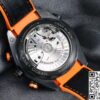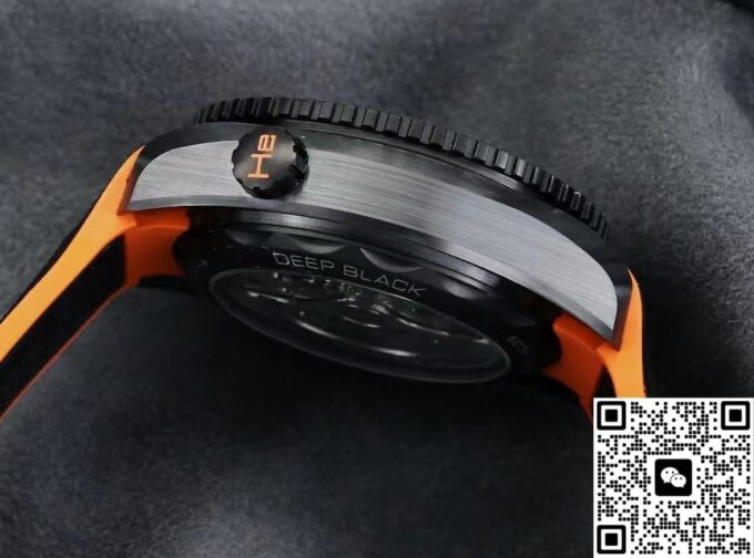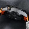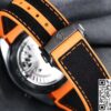 表带采用黑色橡胶材质,表面压印细密纹理,增强透气性与贴合度,即使在湿热的航海环境中,也能保持舒适体感。橙色缝线与表盘指针颜色相呼应,形成视觉上的统一协调。随表附赠一条同色系橡胶表带及两条互补色NATO表带(深灰与藏蓝),满足不同场合的搭配需求——商务场合可选择简约NATO表带,尽显干练;运动或休闲时,橡胶表带的活力橙色则成为点睛之笔。表扣以陶瓷与精钢结合打造,边缘经倒角处理至圆润无棱角,扣合时咔嗒声清脆利落,锁定牢固且佩戴便捷,细节之处尽显工艺匠心。