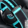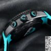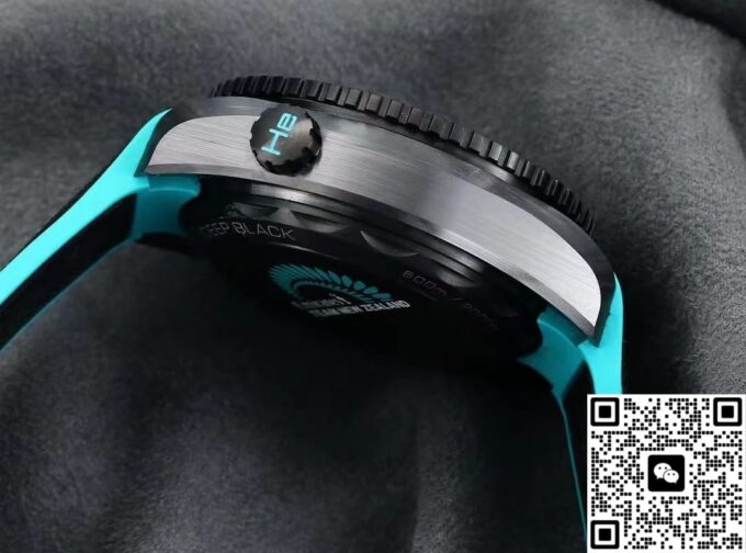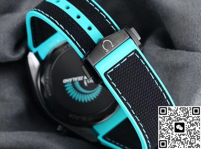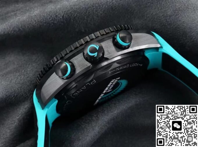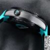 表带采用橡胶材质,饰以绿松石色缝线,与表盘的色彩相呼应,整体感十足。橡胶材质具有良好的柔韧性与透气性,贴合手腕曲线,即使长时间佩戴也不会产生闷热感或不适感。运动或休闲时,橡胶表带则更显活力。陶瓷表扣设计精致,经过精细打磨,边角圆润光滑,不仅佩戴舒适,且坚固耐用,能牢固锁定表带,确保腕表在各种活动中都不会轻易脱落。