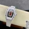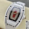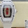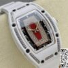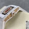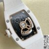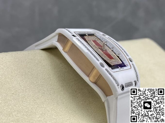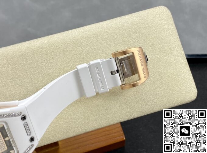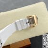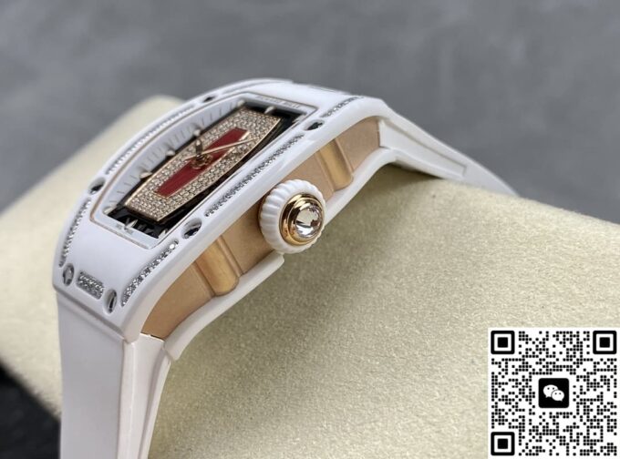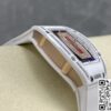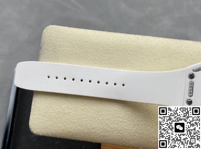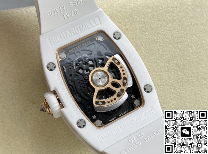 表径方面,45.66 x 31.40 毫米的尺寸,精准复刻原装酒桶形表壳的独特比例,这种不规则却极具辨识度的形状,是理查德・米勒的标志性设计之一。表壳厚度 11.85 毫米,在保证内部机芯容纳的同时,塑造出贴合手腕的佩戴质感。黑色表盘搭配白色表带,色彩对比经典且富有视觉冲击。背透表底设计,让机芯的运转之美得以展现,虽为复刻,却也尽力呈现高端制表的 “透视” 美学,满足表迷对机械结构的观赏需求。50 米防水性能,赋予其一定日常防护能力,应对生活中的溅水等场景,契合实用与美观兼具的制表理念。表壳材质采用 ZTA 陶瓷与钛花键螺钉、不锈钢耐磨垫圈组合,ZTA 陶瓷的坚韧与独特质感,为表壳带来耐用性与视觉高级感,钛花键螺钉则在紧固部件的同时,增添细节工艺美,复刻出原装在材质运用上的巧思。表盘材质选用碳纤维,这种轻质且强度高、富有科技感的材质,是理查德・米勒常用的元素,为表盘赋予独特纹理与质感,与整体风格相得益彰。表镜材质为蓝宝石(硬度 1800 威格士),并进行防眩光处理(两侧) ,蓝宝石的高硬度保障表镜耐磨抗刮,防眩光处理则让读取时间时,在不同光线环境下都能清晰无碍,复刻出原装在表镜功能性与实用性上的考量。表冠材质同样采用 ZTA 陶瓷,搭配两个 Nitril O 形密封圈,既保证操作时的手感与美观,又在防水等性能上助力,细节之处尽显复刻的用心。