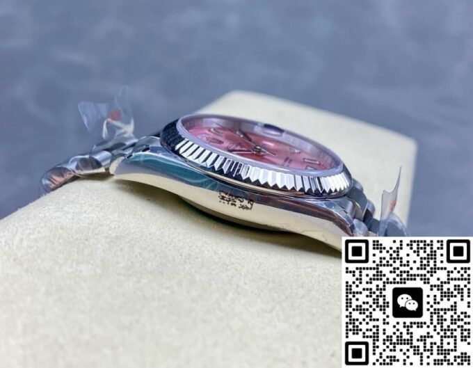 从佩戴体验出发,复刻劳力士 Rolex m128239 – 0071 注重细节复刻。表径 36 毫米,搭配圆形表盘,整体比例协调,无论是搭配正装出席商务会晤,还是搭配休闲装开启日常出行,都能自然融入风格,轻松驾驭多种场景。粉红色表盘与银色表带搭配和谐,形成视觉连贯感,隐蔽式搭叠皇冠带扣设计确保佩戴牢固,同时可依据手腕粗细灵活调节。银色表带的质感与表壳精致复刻工艺相融合,带来舒适且不失格调的佩戴感受,让这款复刻表不只是计时工具,更是彰显个人风格的时尚配饰。