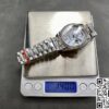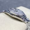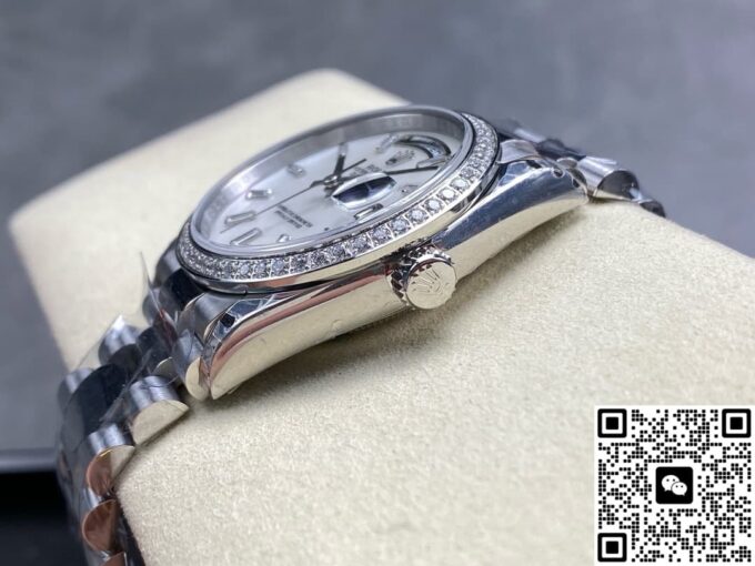 表圈同样采用仿白金材质,并镶嵌有钻石,进一步提升了手表的奢华感。钻石的镶嵌工艺精湛,紧密且牢固,与表圈完美结合,展现出复刻工艺的高超水准。表镜选用防刮损蓝水晶材质,不仅具备出色的耐磨性能,能够有效抵御日常使用中的刮擦,而且还具备良好的透光性,搭配小窗凸透镜放大日历功能,让日期显示更加清晰易读。即使在强光环境下,也能最大程度减少反光干扰,为佩戴者提供清晰的读时体验。