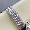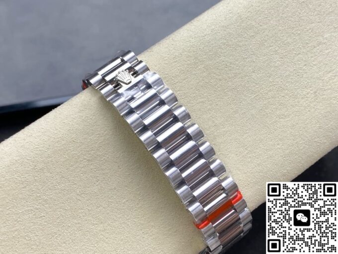 表带材质为仿白金材质,采用元首型(President)三格拱形链节设计,这种经典的链节设计不仅美观大方,而且佩戴起来舒适贴合手腕。每一个链节都经过精心制作,细节之处尽显复刻工艺的精湛,与表壳材质相呼应,共同营造出整体的高贵质感。