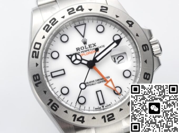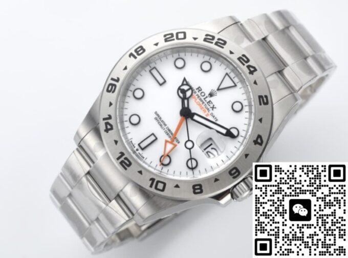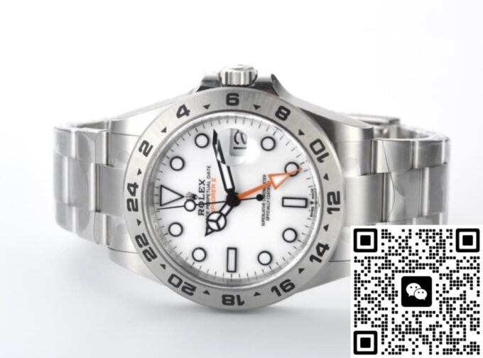 此复刻手表延续了劳力士探险家系列的经典设计语言,42毫米的表径尺寸大气而适中,完美适配男士腕间。最引人注目的莫过于其纯净的白色表盘,色调明亮纯粹,为各项功能显示提供了绝佳背景。表盘上的时标设计尤为出色,采用立体镶嵌的几何造型,并涂覆有长效夜光材料,无论白昼还是暗夜环境,都能确保时间清晰可辨,复刻手表的易读性堪称典范。搭配表盘的银色蚝式钢表带,三排链节结构不仅经典美观,更提供了舒适的佩戴体验。表扣采用坚固可靠的摺叠蚝式保险扣,并配备了便捷的5毫米易调链节延展系统,无需工具即可微调表带长度,轻松适应不同手腕粗细或佩戴环境需求,细节之处尽显对实用性的考量。