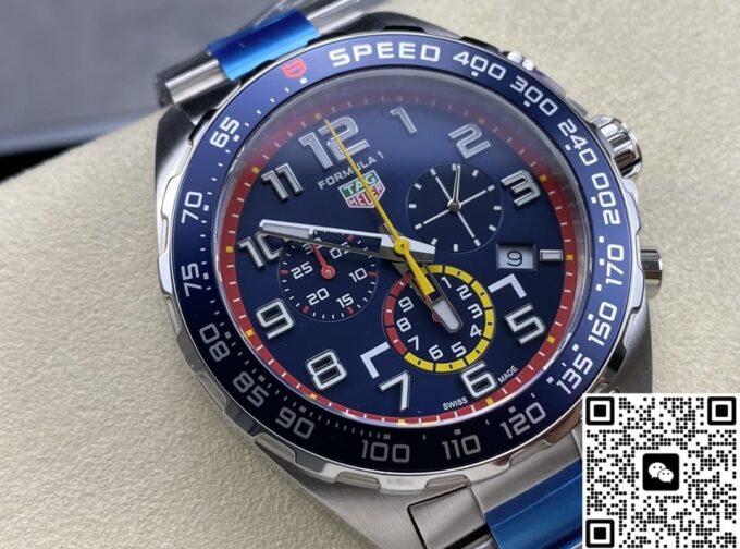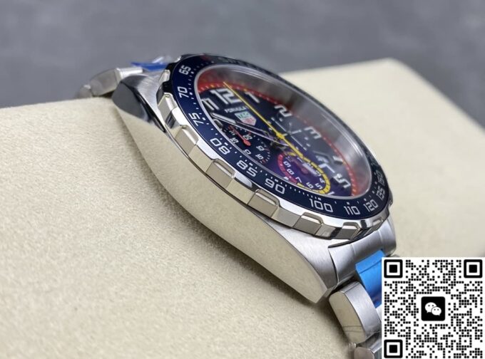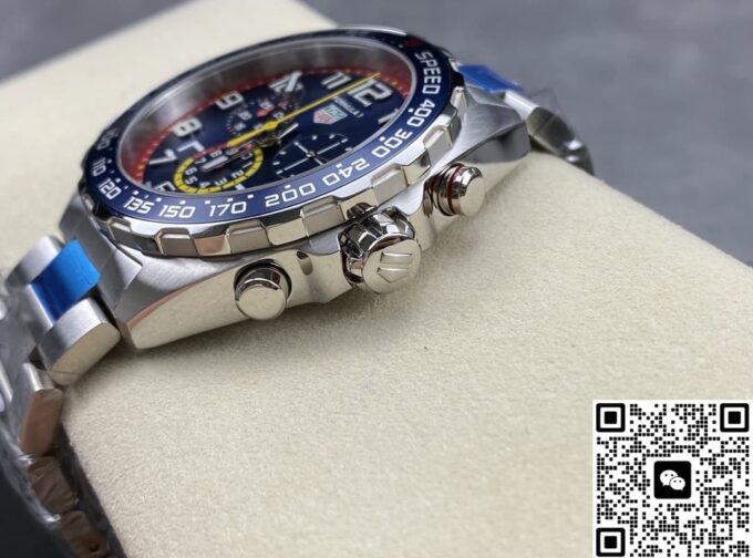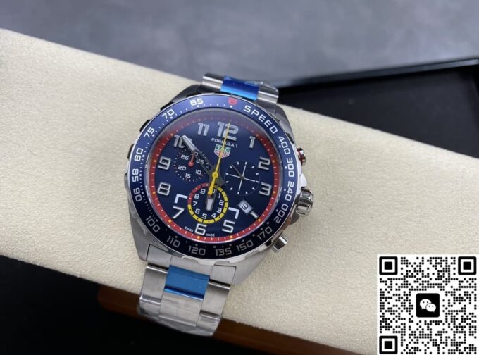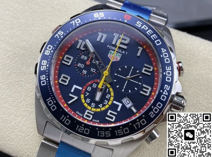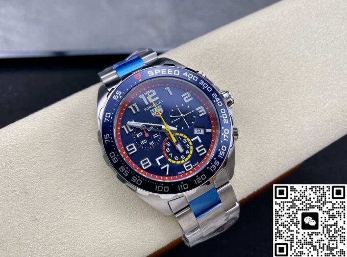 复刻泰格豪雅TAG Heuer F1 CAZ101AL.BA0842的表盘采用蓝色调,圆形轮廓充满运动张力,尽显品牌经典时尚基因。阿拉伯数字时标清晰锐利,与指针配合默契,读时精准高效。蓝色表盘在光影下呈现独特视觉效果,既适配运动场景的活力氛围,又能在日常佩戴中彰显个性魅力。表盘布局紧凑,功能显示直观,复刻工艺精细复刻正品设计细节,每处线条、刻度都经雕琢,凸显复刻表的工艺质感。表圈以铝材质打造,减轻重量的同时,与蓝色表盘形成色彩对比,增强视觉层次,展现运动腕表的独特风格。
