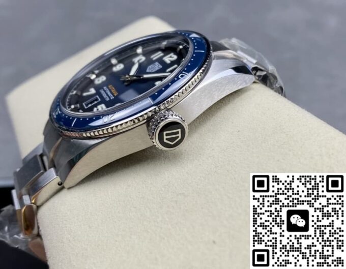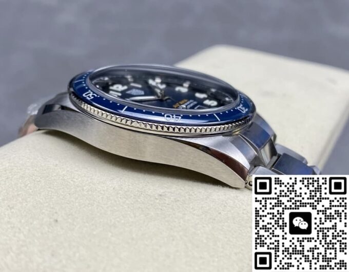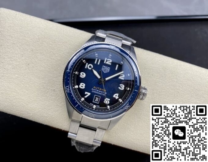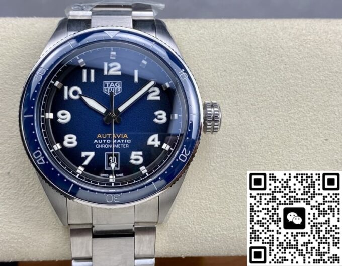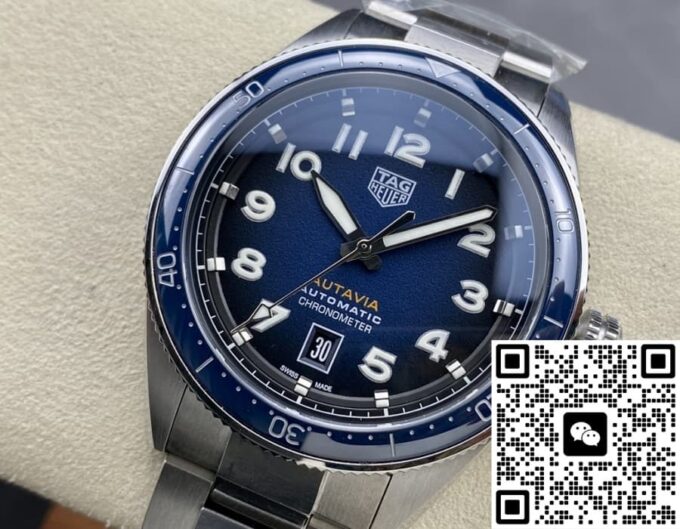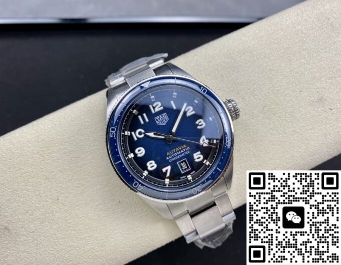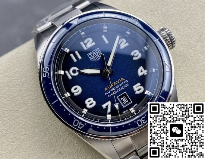 表盘材质方面,镀铑时标和指针,搭配涂有 SuperLuminova荧光涂料,不仅让时标、指针外观精致,提升读时清晰度,荧光涂料实现夜光功能,黑暗中散发柔和光亮,助力准确读时。表圈采用蓝色陶瓷双向旋转表圈,陶瓷材质具备高硬度、耐磨损、不易褪色等特性,蓝色陶瓷与表盘色彩相衬,双向旋转功能,为手表增添实用把玩性,契合 AUTAVIA 系列的运动基因,复刻工艺精准还原这一特色部件,让表圈无论是外观还是功能,都贴近正品表现。